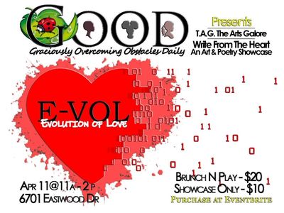 E-Vol is an explanation of LOVE backwards depicting the ups and downs, ins and outs and love's evolution shown through the Arts of drama, dance interpretations, poetry and play productions in partnership with T.A.G. to help reach young artist through the Arts and serves as a productive outlet.